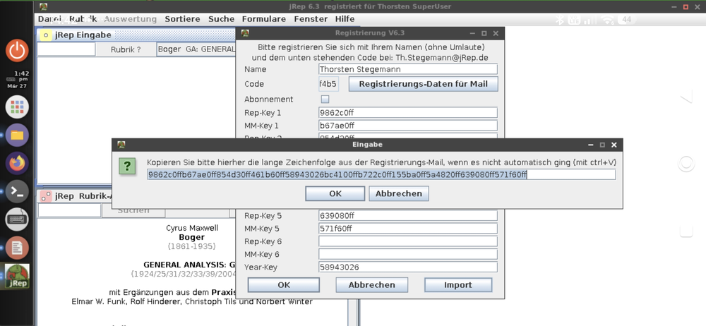 Für die Freischaltung des Programms benötige ich den vierstelligen Code aus dem jRep-Registrierungsfenster im Menü Hilfe.