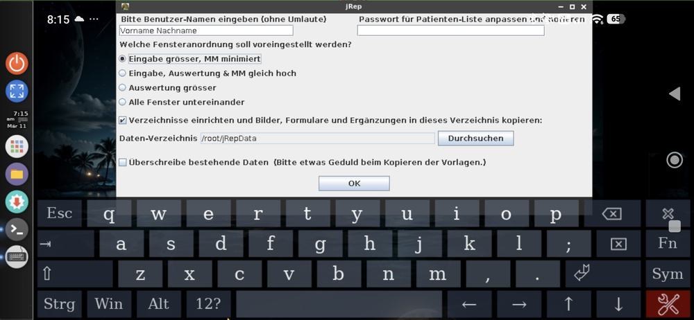Im Initialisierungs-Fenster geben wir unseren Namen (ohne Umlaute) ein und ggf. ein Passwort für die Patienten-Liste.