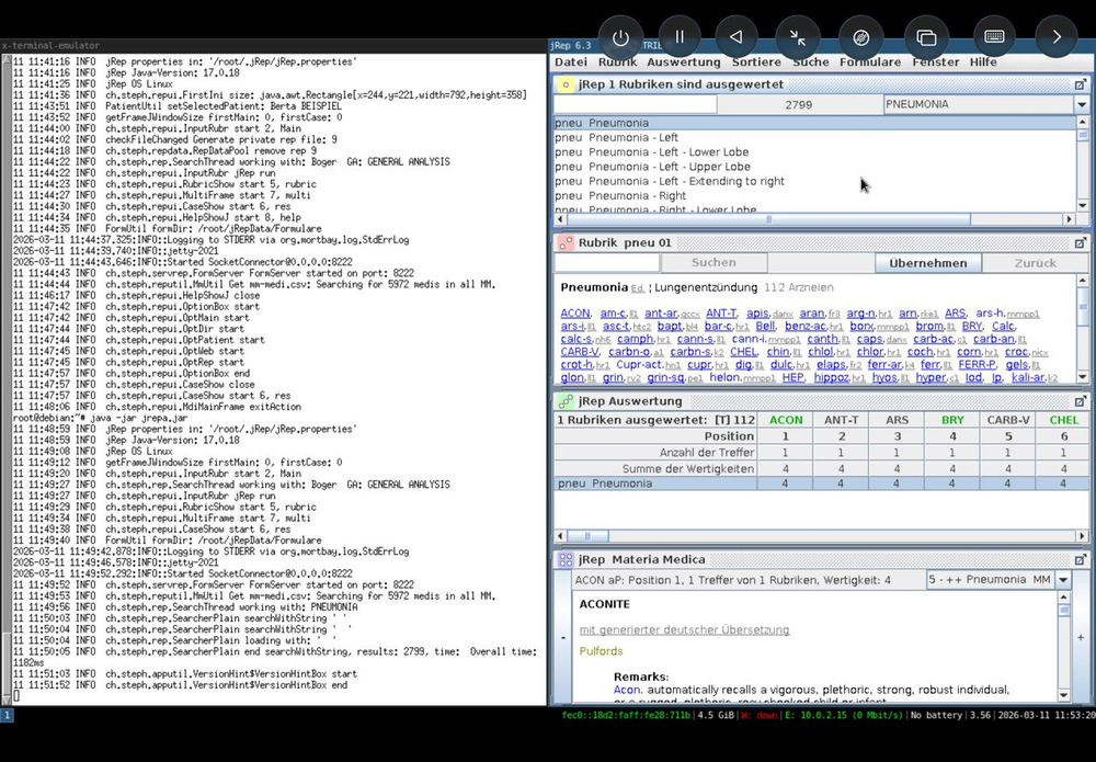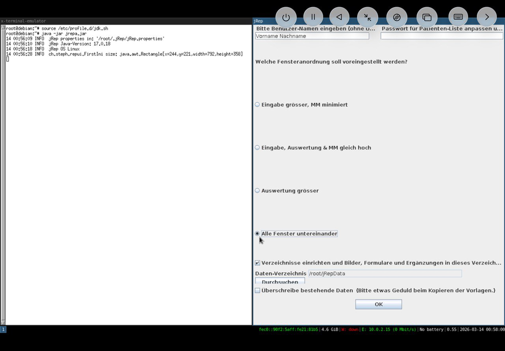 Kurioserweise erscheint das jRep-Fenster rechts, während wir links im Terminal das fortlaufende Log sehen.
