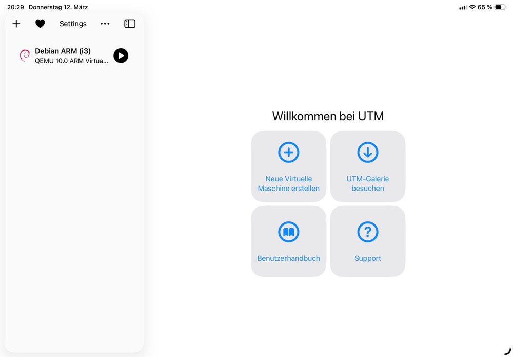 Nun starten wir Linux, indem wir auf den Pfeil links oben tippen: