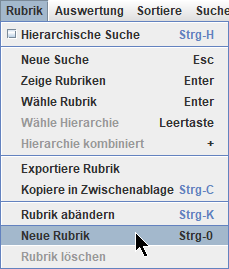 Dann wählen wir im Menü 'Rubrik' oder im Kontext-Menü den Eintrag 'Neue Rubrik':