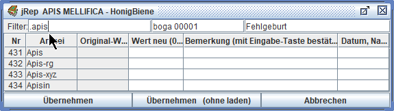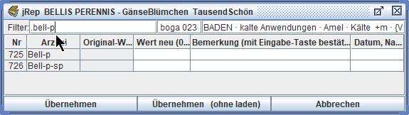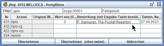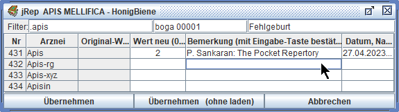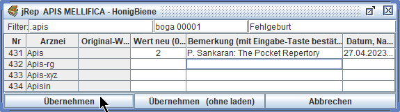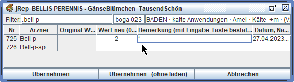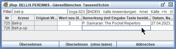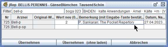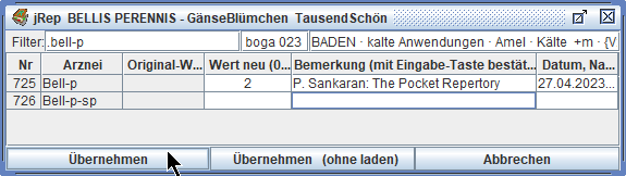 Das Repertorium wird dann neu geladen und unsere Eingaben stehen für eine Übernahme in die Auswertung zur Verfügung.
