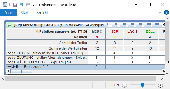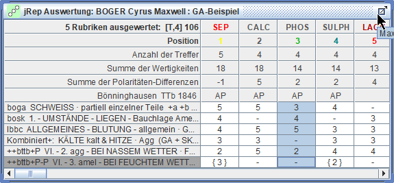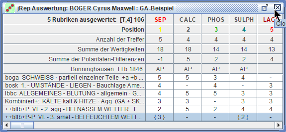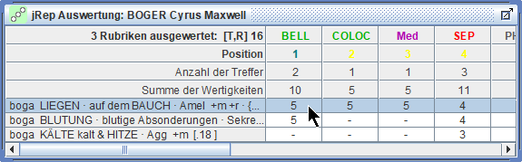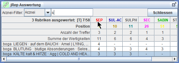 erscheint in der Auswertung eine weitere Zeile, in der die miasmatischen Zuordnungen der Arzneien angezeigt werden.