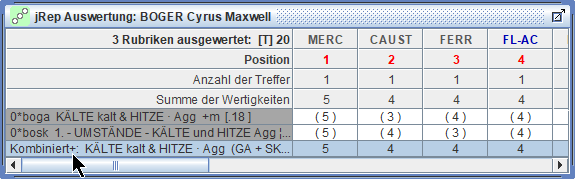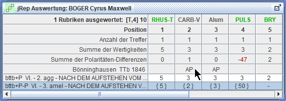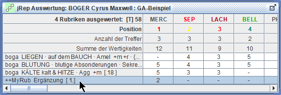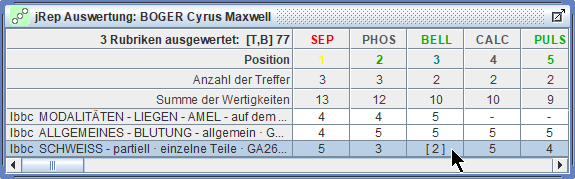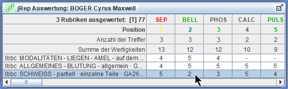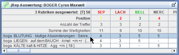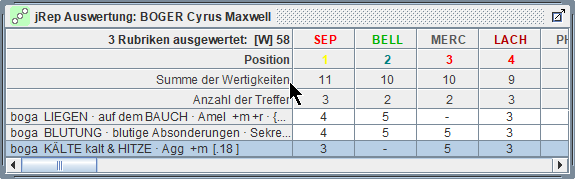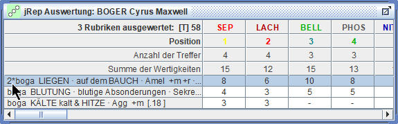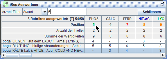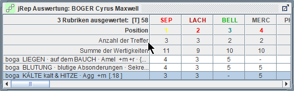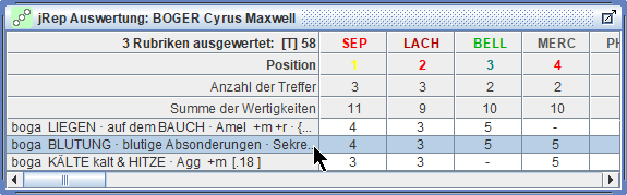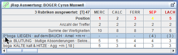 die Treffer und Wertigkeiten der Arzneien der markierten Rubrik schrittweise multiplizieren,