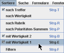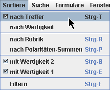 Wir sehen dies auch im Menü 'Sortiere' an dem Häkchen vor dem Eintrag 'nach Treffer'.