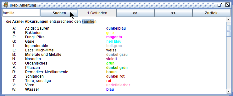 Arzneimittel-Filter für Position, Name, Familie oder miasmatischer Haltepunkt 3.8 Strg/ctrl+G: