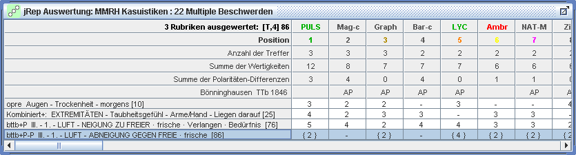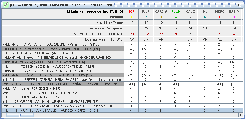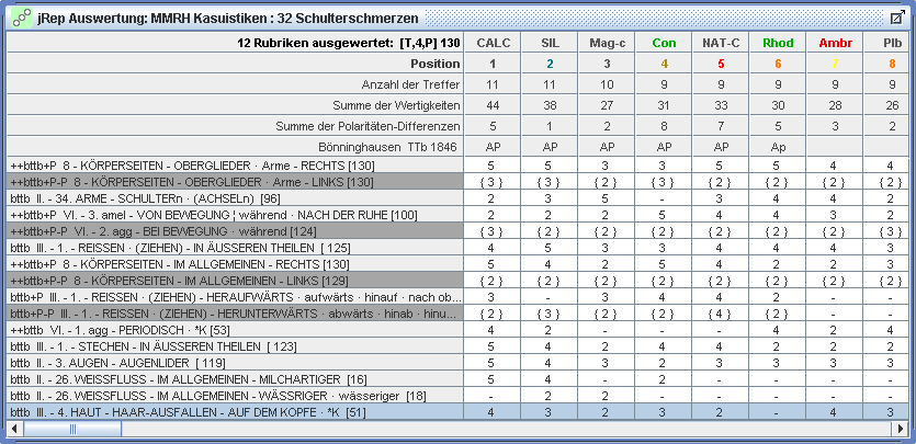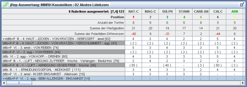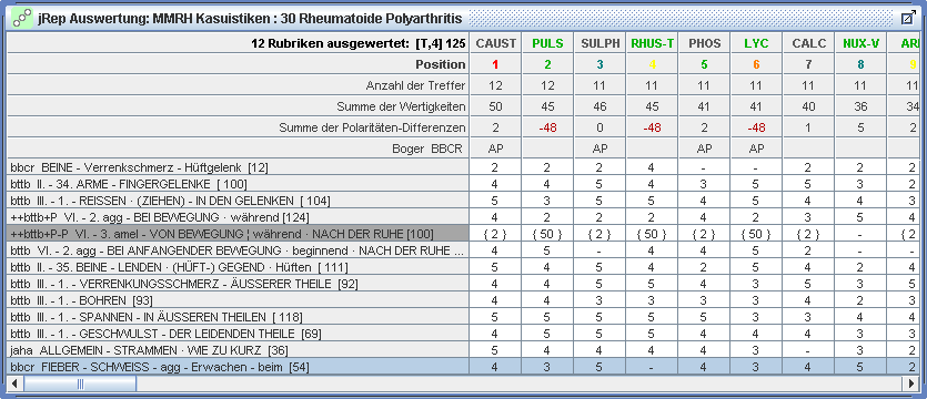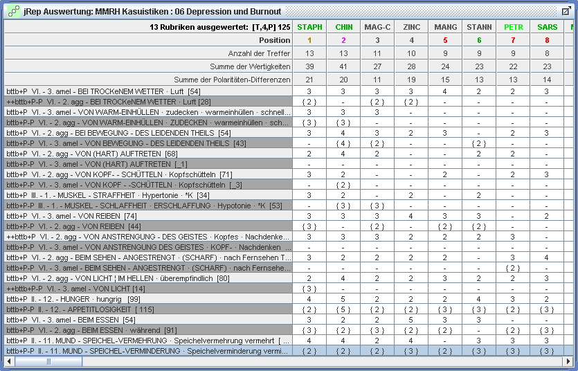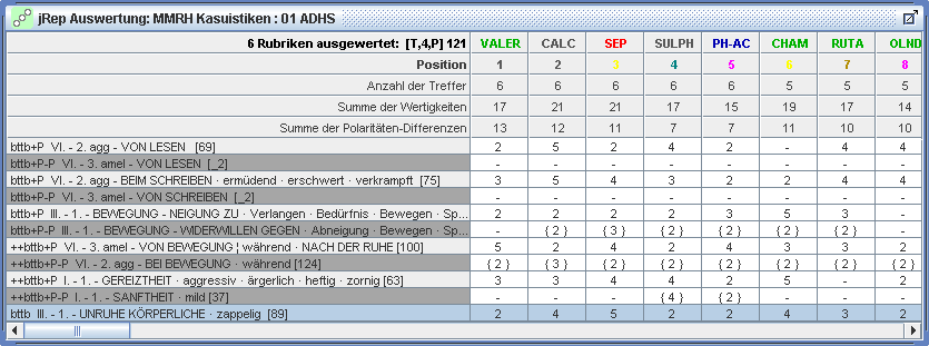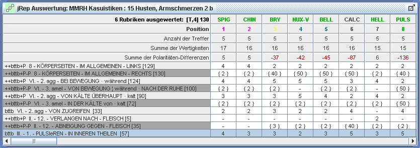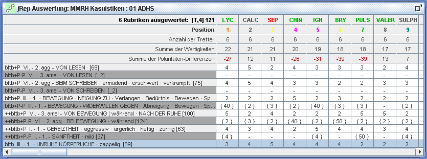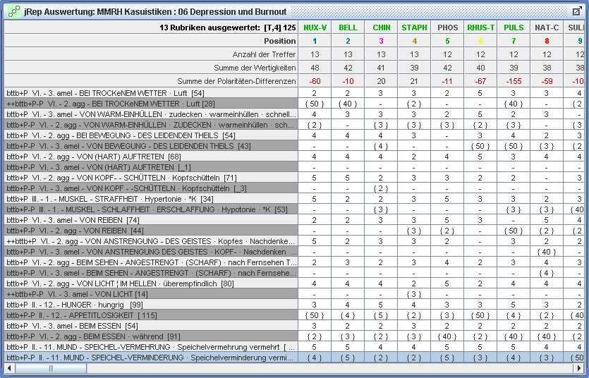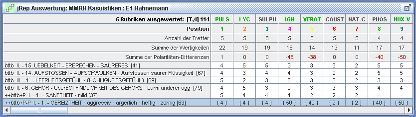 Dies ist die Auswertung des 1. Falles aus dem MMRH-Kasuistiken-Buch vor der Anwendung der optimierten Polaritätsanalyse nach Heiner Frei: ![]() Das ist die Auswertung nach Anwendung der optimierten Polaritätsanalyse von jRep: ![]() Die zu differenzierenden Mittel waren Valeriana, Calcium und Sepia. |