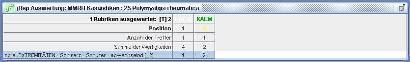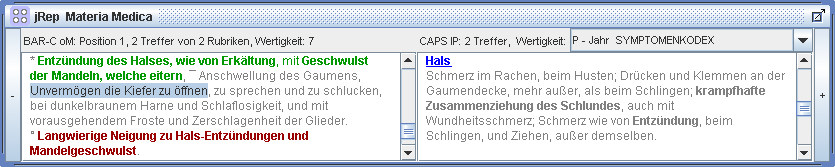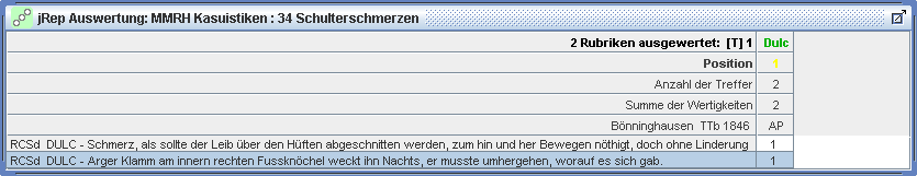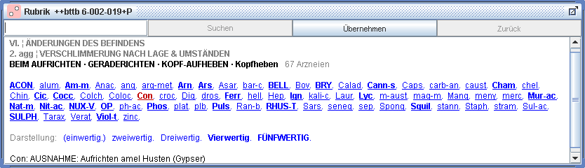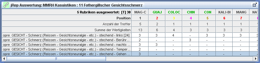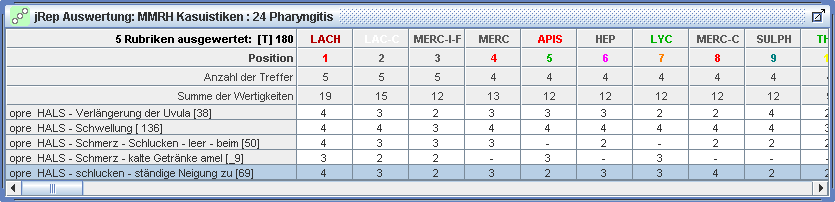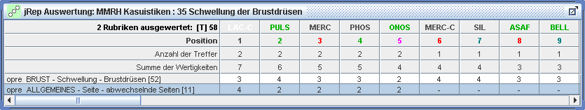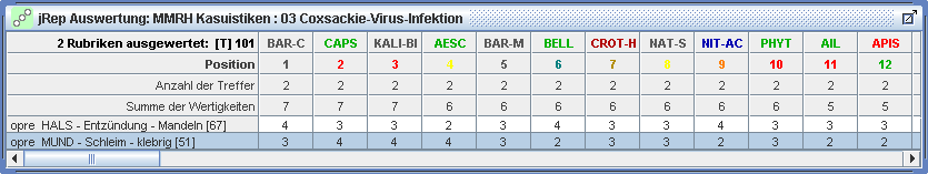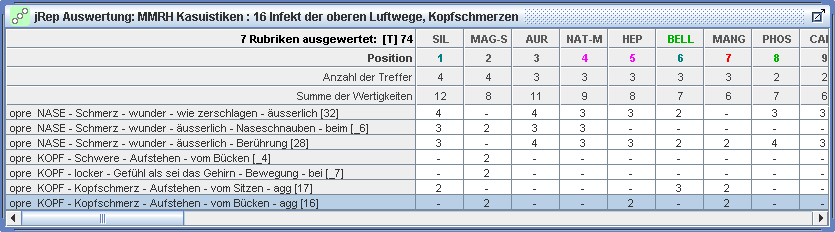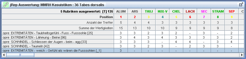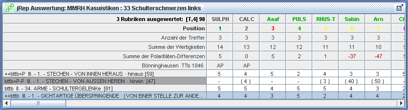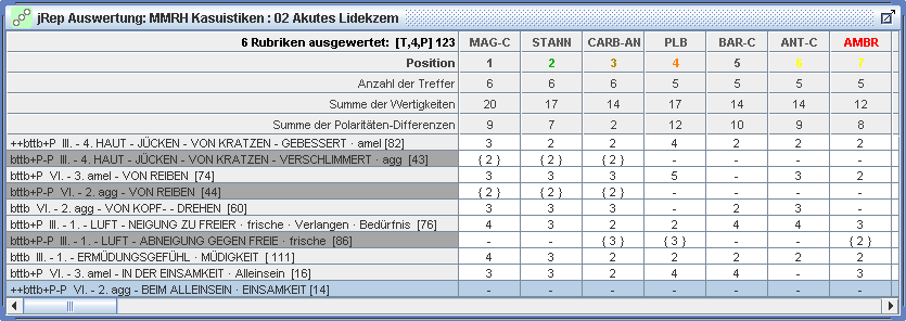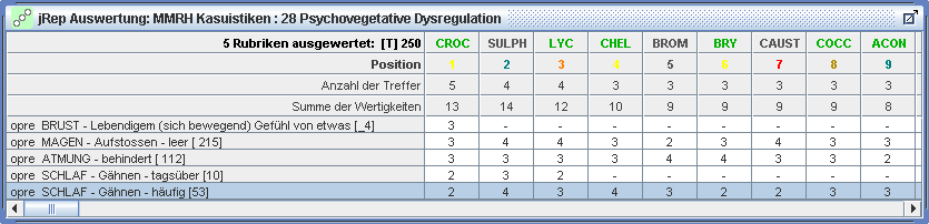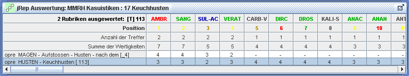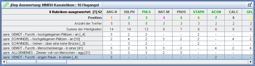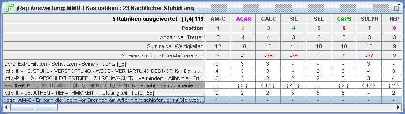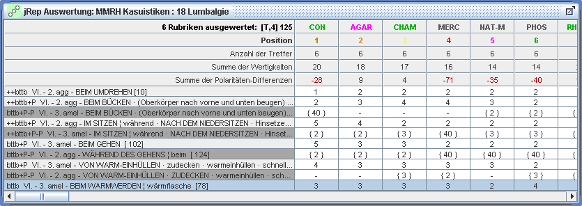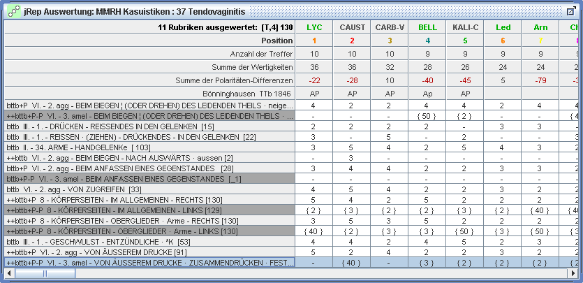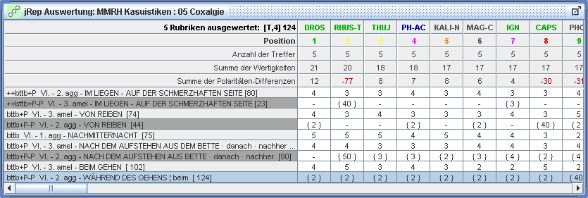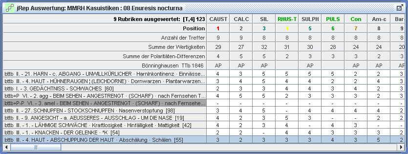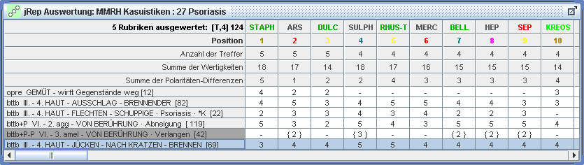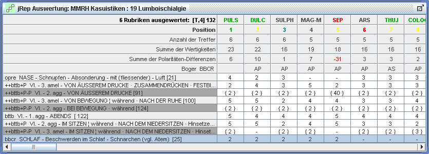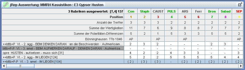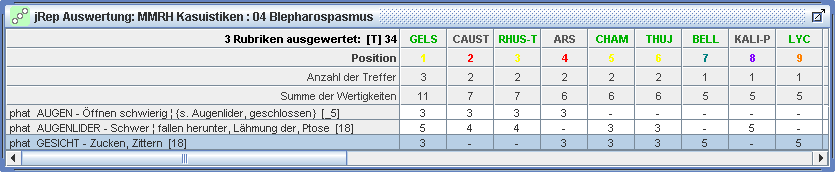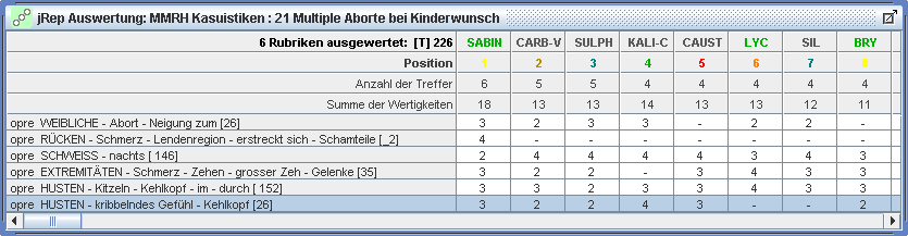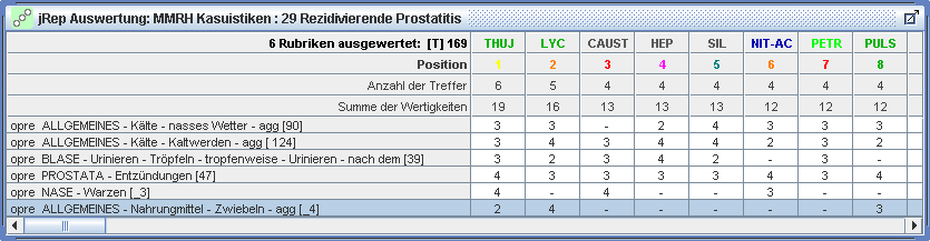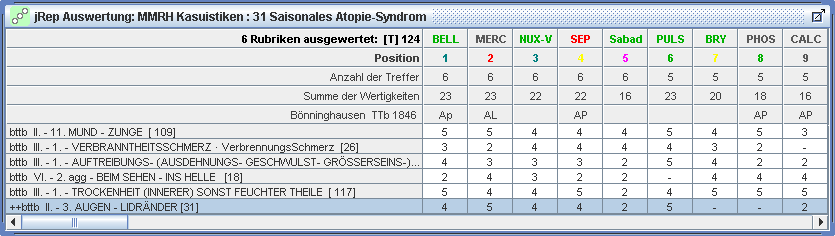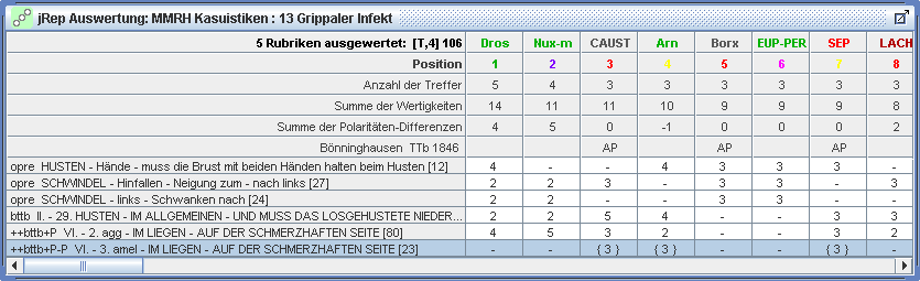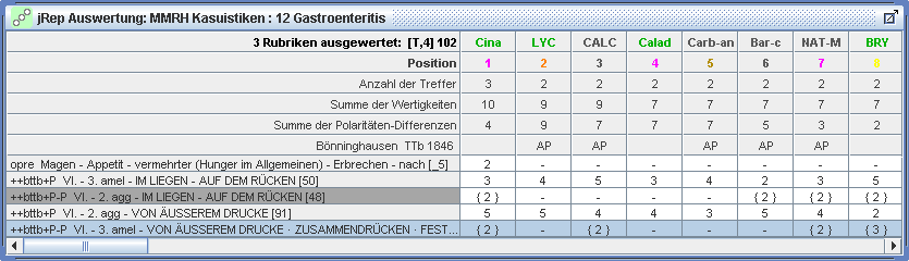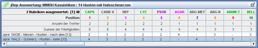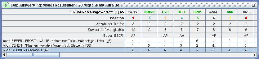 Dies ist die Auswertung des 20. Falles aus dem MMRH-Kasuistiken-Buch:![]() Das Mittel war Causticum (ebenfalls an Position 5 :-) Dies ist die Auswertung des 20. Falles aus dem MMRH-Kasuistiken-Buch einfach gelöst mit dem BBCR: ![]() |