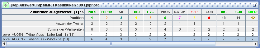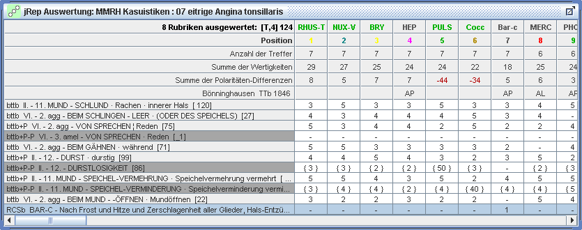 Dies ist die Auswertung des 1. Einführung-Falles aus dem MMRH-Kasuistiken-Buch:![]() Das Mittel war Pulsatilla. |