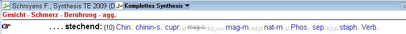 Dies ist die Auswertung des 11. Falles aus dem MMRH-Kasuistiken-Buch:![]() Das Mittel war Magnesium carbonicum. Interessanterweise soll es sich bei Mag-c. in der Rubrik: "GESICHT - Schmerz - stechend - bei Berührung" um einen Fehleintrag halten, so dass alle Folgerepertorien stattdessen Mag-m. enthalten: ![]() |