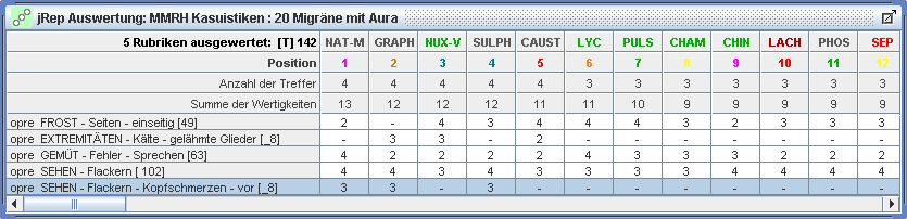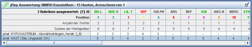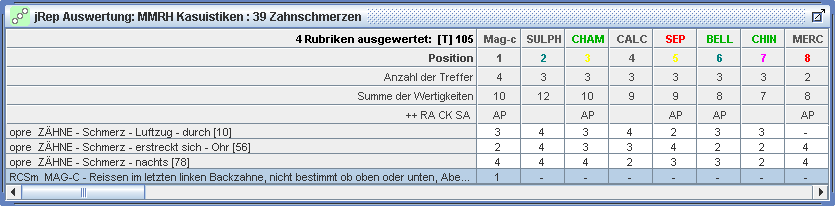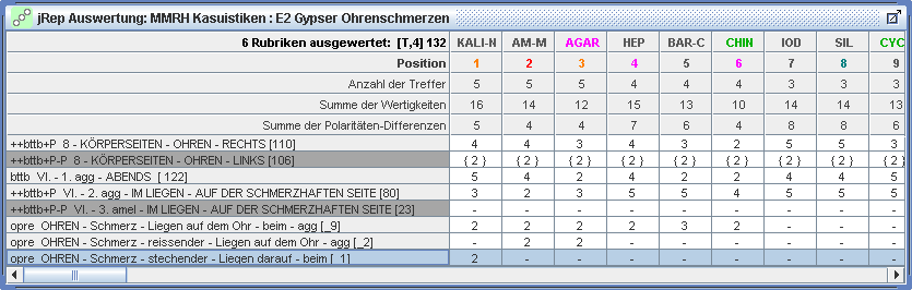 Dies ist die Auswertung des 12. Falles aus dem MMRH-Kasuistiken-Buch:![]() Das Mittel war Cina. |