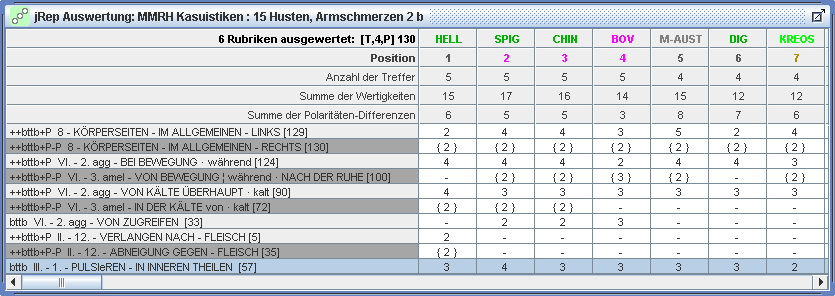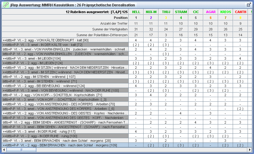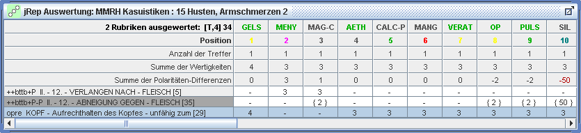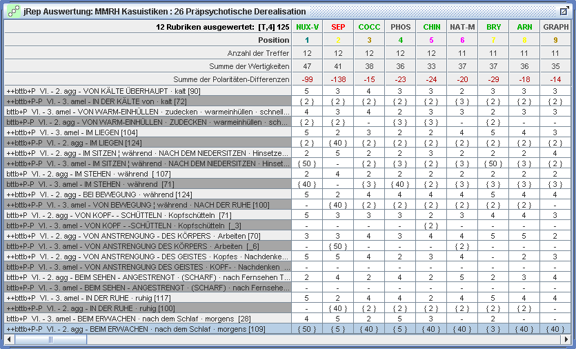 Dies ist die Auswertung des 26. Falles aus dem MMRH-Kasuistiken-Buch vor der Anwendung der optimierten Polaritätsanalyse nach Heiner Frei: ![]() Das ist die Auswertung nach Anwendung der optimierten Polaritätsanalyse von jRep: ![]() Die zu differenzierenden Mittel waren Helleborus und Nux moschata. |