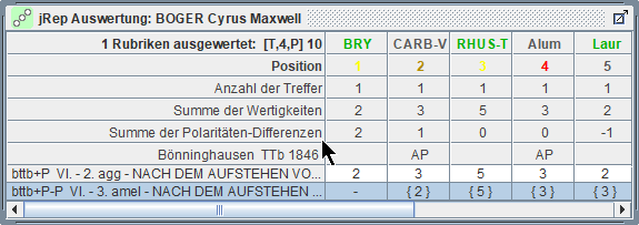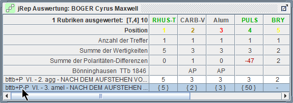 Die heilende Arznei sollte in allen gewählten Rubriken enthalten sein, d.h. eine maximale Anzahl an Treffern aufweisen. |